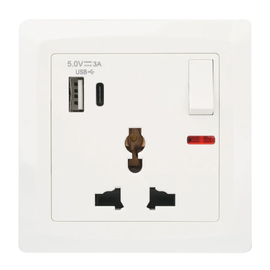 The Terminator Universal Socket With USB-A & USB-C Outlet - TWS 1SUI-2UAC combines convenience and versatility in one unit. It features a universal socket for various plug types and both USB-A and USB-C outlets, allowing you to charge multiple devices simultaneously. Perfect for modern homes and offices.